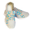 I was so impressed with these black multi coloured shoes and the speed in which they arrived. I have had endless compliments on the colour, sparkle and material which is so soft and cushioned for my feet. Will probably order the sandals too.